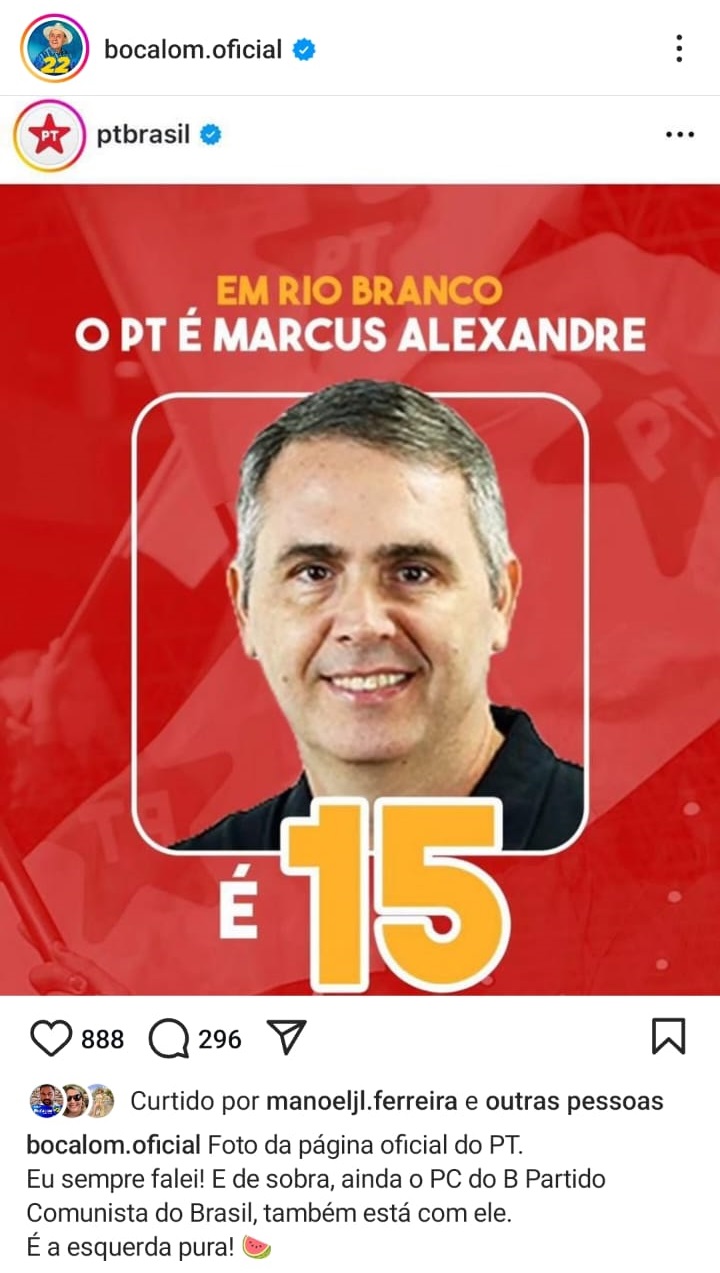 O prefeito de Rio Branco, Tião Bocalom (PP), utilizou suas redes sociais nesta sexta-feira (04) para criticar o apoio oficial do Partido dos Trabalhadores (PT) à candidatura de Marcus Alexandre, ex-prefeito da capital acreana. Em sua publicação, Bocalom destacou que, além do PT, o Partido Comunista do Brasil (PCdoB) também está ao lado de Alexandre na corrida eleitoral, classificando o cenário como “a esquerda pura”.