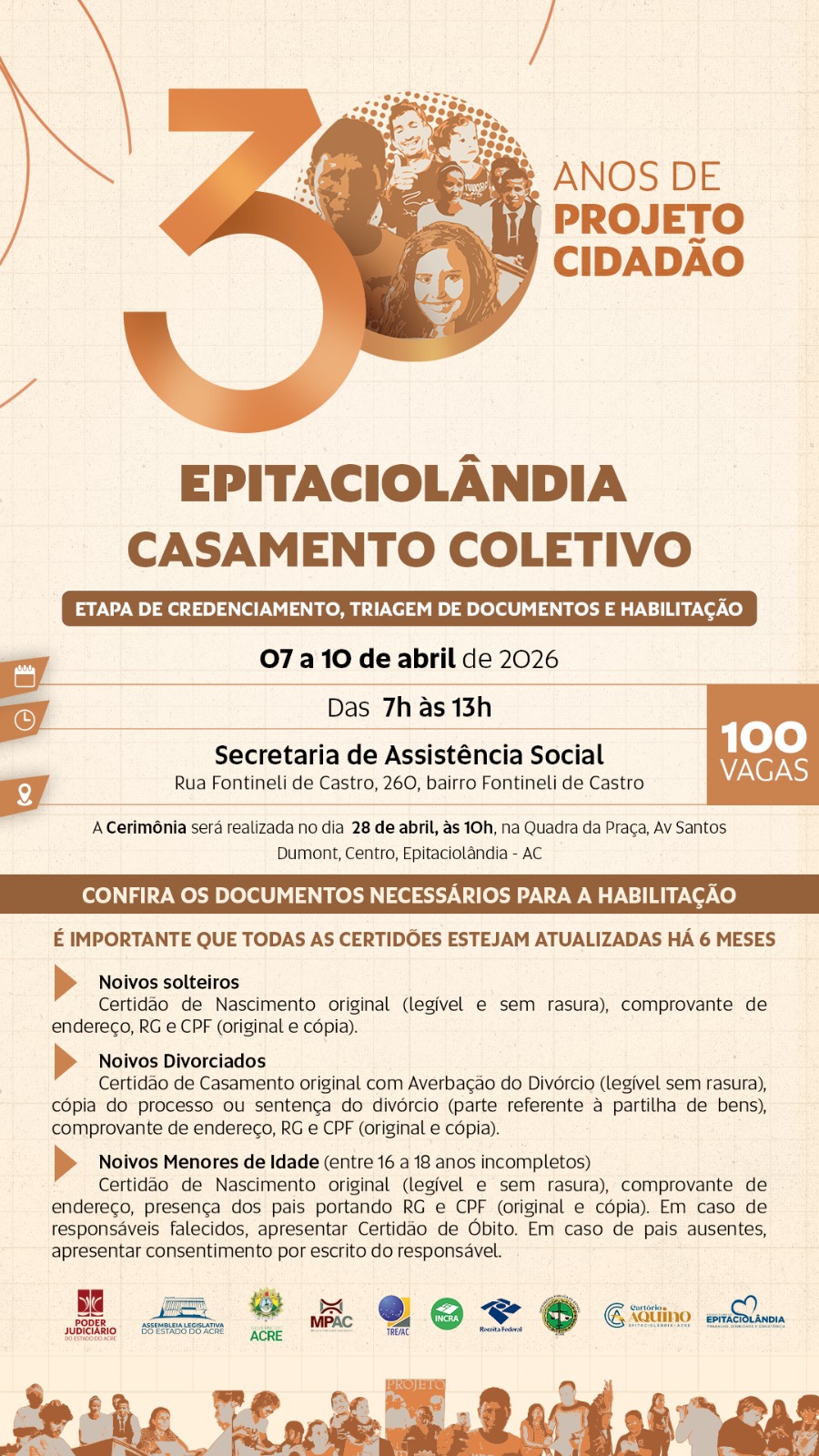 Estão abertas as inscrições para o casamento coletivo em Epitaciolândia até esta sexta-feira, 10. Ao todo, são ofertadas 100 vagas. Os casais interessados em participar devem procurar a Secretaria de Assistência Social do município, localizada na Rua Fontineli de Castro, n° 260, das 7h às 13h.