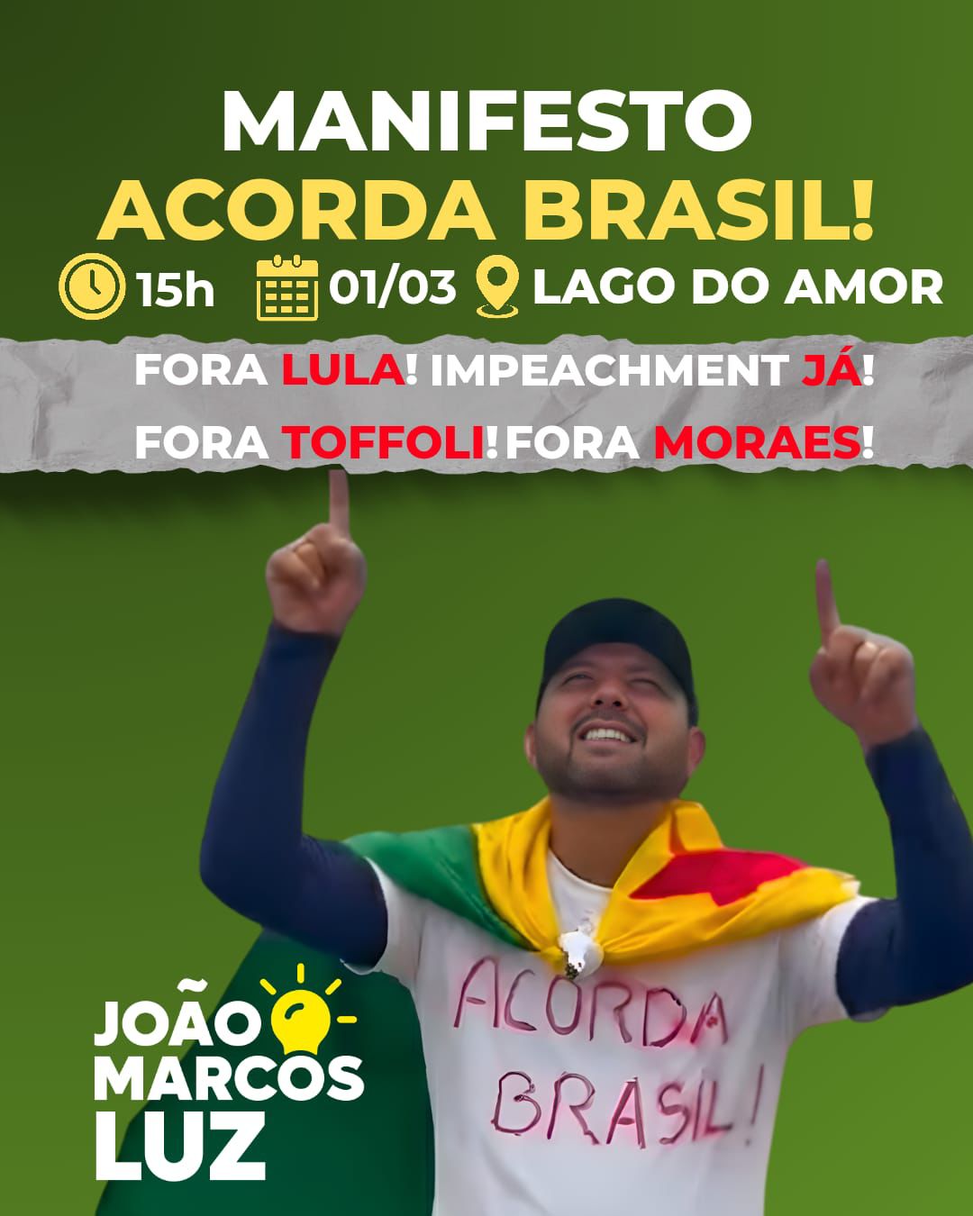 Um ato público com críticas ao governo federal e a ministros do Supremo Tribunal Federal foi convocado pelo secretário municipal de Assistência Social e Direitos Humanos de Rio Branco, João Marcos Luz. A manifestação, intitulada “Acorda Brasil”, está marcada para 1º de março, às 15h, no Lago do Amor.