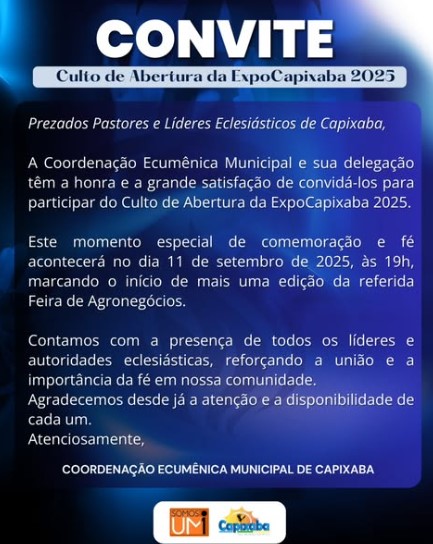 A ExpoCapixaba 2025 será aberta oficialmente no dia 11 de setembro com um Culto Ecumênico especial. A celebração está marcada para as 19h e contará com a presença de pastores, líderes religiosos e autoridades locais, marcando um momento de fé e união para toda a comunidade de Capixaba.