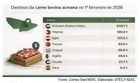 No comércio exterior, os Emirados Árabes Unidos lideram como principal destino da carne acreana em 2026, com 609,7 toneladas embarcadas no bimestre. Em seguida aparecem Filipinas (189,8 t) e Egito (137,5 t), além de mercados como Turquia, Uruguai e Argélia.