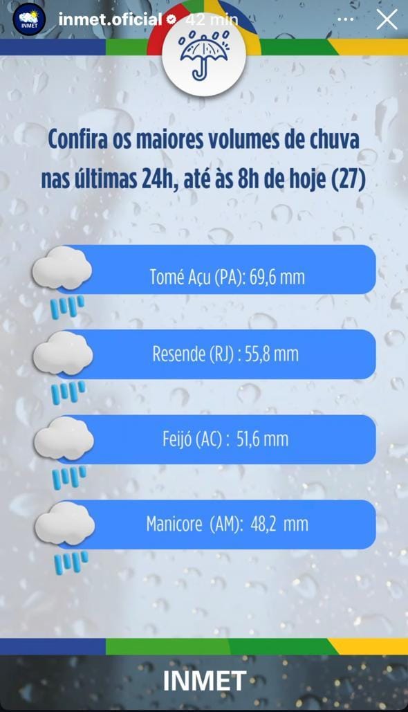 O município de Feijó, no Acre, aparece em destaque no boletim nacional do INMET desta terça-feira (27). Com um acumulado de 51,6 mm nas últimas 24 horas, a cidade registrou o terceiro maior volume de chuva de todo o Brasil.