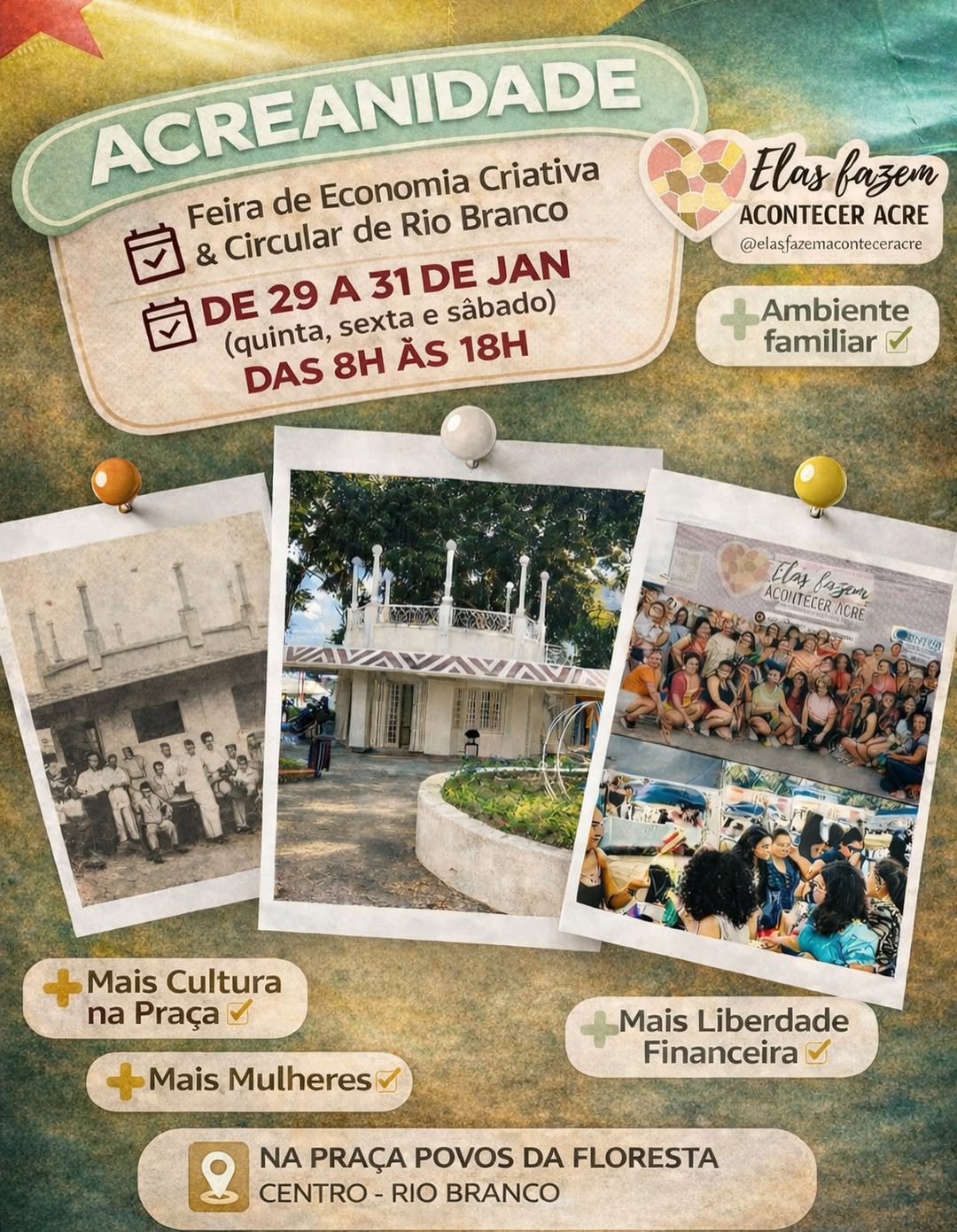 De 29 a 31 de janeiro, das 8h às 18h, a Praça dos Povos da Floresta será palco da Feira Acreanidade, uma iniciativa que propõe a retomada afetiva, cultural e econômica dos espaços públicos do centro de Rio Branco, por meio de uma ocupação organizada, criativa e cheia de vida.