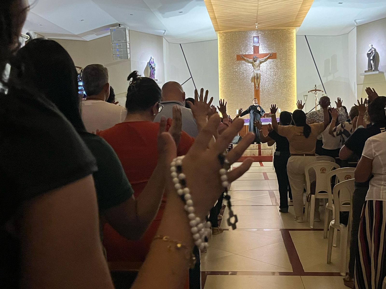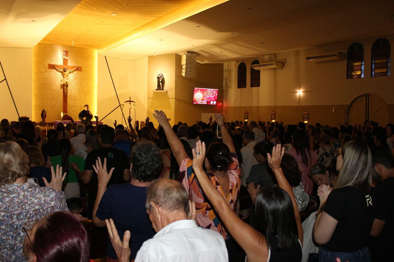 A Paróquia São Peregrino encerrou, nesta quinta-feira, 10, o 7º Cerco de Jericó – “Eis-me aqui, Senhor”. O santuário ficou lotado de fiéis e paroquianos que viveram mais uma noite de fé, louvor e adoração. Todos oraram unidos e assistiram à queda dos muros e se emocionaram com as sete voltas do Santíssimo.