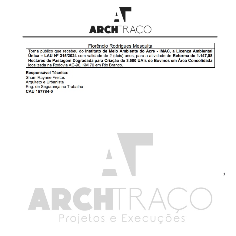 EDITAIS Florêncio Rodrigues Mesquita, torna publico que recebeu LAU do Instituto de Meio Ambiente do Acre – IMAC Publicado 1 ano atrás em 16 de outubro de 2024 Por Redação AcreNews Tópicos relacionados: A seguir Tomaz Navegações Ltda informa que requereu do Imac licença para comércio de combustíveis em Tarauacá Não perca Prefeitura de Plácido de Castro divulga edital de licitação para construção de escola rural de apoio a produtores Continue lendo Você pode gostar