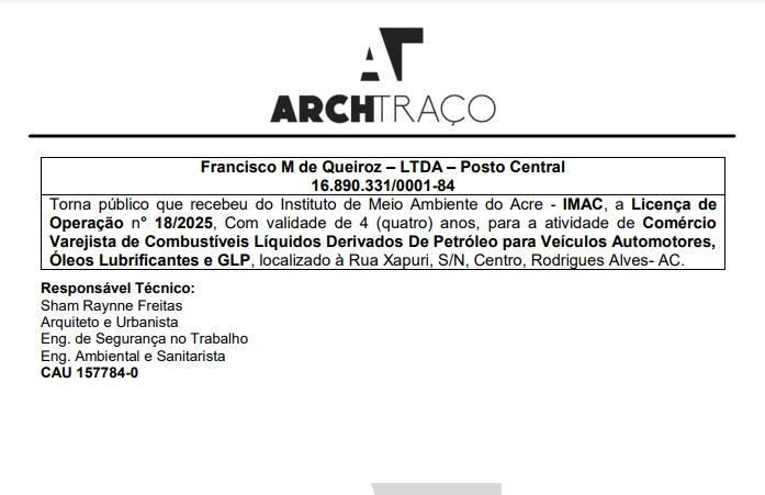 EDITAIS Francisco M de Queiroz – LTDA, torna público que recebeu do IMAC a renovação da licença para comércio varejista de combustível em Rodrigues Alves Publicado 9 meses atrás em 17 de fevereiro de 2025 Por Redação AcreNews Tópicos relacionados: A seguir Assincra publica edital de convocação da assembléia geral ordinária do mês de fevereiro de 2025 Não perca A Rodrigues Maia torna publico que recebeu do IMAC a licença de operação para Comercio varejista de petróleo em Jordão Continue lendo Você pode gostar