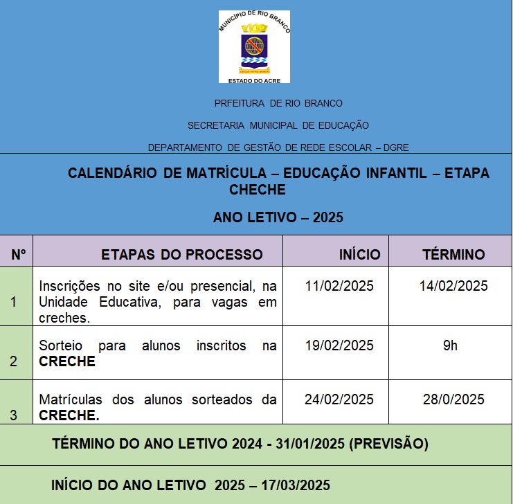 A Secretaria Municipal de Educação D de Rio Branco (Seme) está ofertando cerca de 1.600 vagas para crianças em idade de creche. As inscrições poder ser feitas também presencialmente nas creches da capital de 11 a 14 de fevereiro de 2025, das 7h às 11h e das 13h às 16h30, de segunda a sexta-feira. Para candidatar-se à vaga na unidade educativa, deve-se, prioritariamente, obedecer a faixa etária da criança para o ingresso na Educação Infantil, assim sendo: Berçário: Bebês a partir de 4 meses até 1 ano e 6 meses de idade. Para essa faixa etária há vagas somente na Unidade Educativa CEI Maria Danila Pompeu, na Cidade do Povo. Creche: A partir de 1 ano e 7 meses, até 3 anos e 11 meses de idade. As vagas estão nas 13 creches e 14 Centros de Educação Infantil (CEI) de Rio Branco.