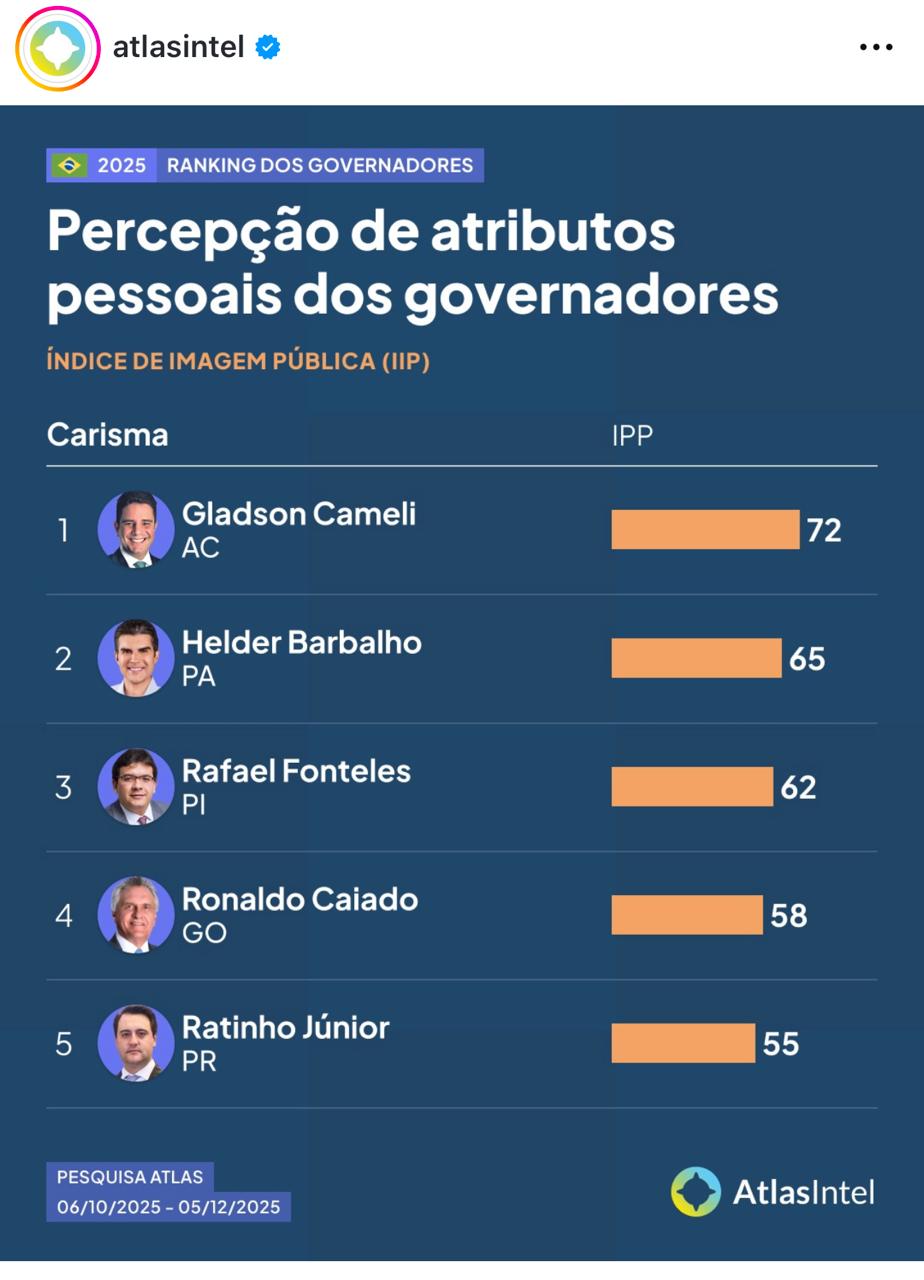 O Acre voltou a ganhar destaque nacional com um resultado positivo na avaliação da opinião pública. Levantamento do Atlas Intel sobre a percepção de atributos pessoais dos governadores aponta o governador Gladson Cameli como o mais carismático do país, ocupando a primeira colocação no ranking.