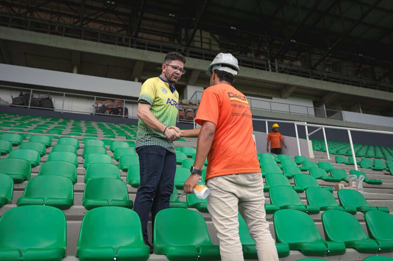 “É uma alegria poder receber o governador vistoriando essa obra, que foi algo que ele nos pediu muito, para que a gente pudesse executar o mais breve possível. O gramado já está pronto, as arquibancadas em 40 dias estarão prontas, todas trocadas, tudo pintado direitinho, acessibilidade, segurança, elevadores. Então, em breve, nós vamos estar entregando esse belo palco”, pontuou.