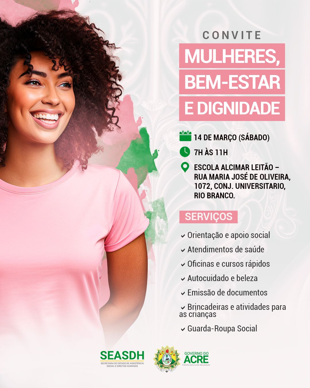 O Governo do Estado, por meio da Secretaria de Assistência Social e Direitos Humanos (SEASDH), realiza neste sábado, 14 de março, uma das ações mais importantes do mês dedicado às mulheres: o projeto “Mulher: Bem-Estar e Cidadania”. O evento acontece na Escola Alcimar Leitão, no bairro Universitário, das 7h às 11h.