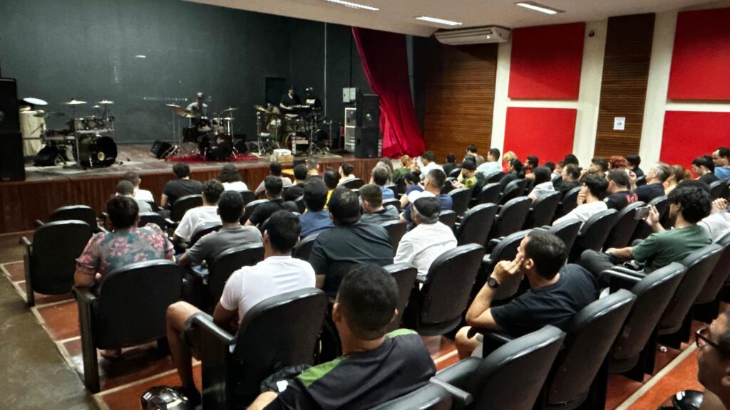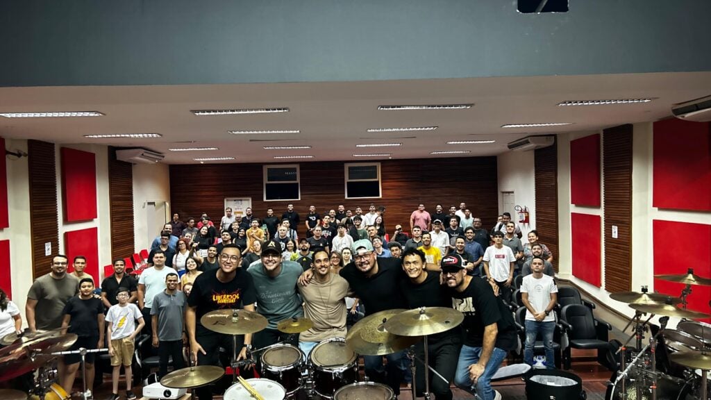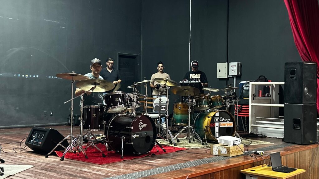 Os convidados responderam dúvidas, compartilharam vivências e reforçaram a importância do estudo contínuo. Alê Batera relembrou como iniciou sua jornada: “Comecei montando panelas no fundo do quintal e, depois de um tempo, comecei a me profissionalizar, a estudar rudimentos, só que chegou a um ponto que só o rudimento não estava suprindo; foi quando eu passei para a parte da teoria. Isso aí tanto para profissional quanto iniciante é fundamental”, relatou.
