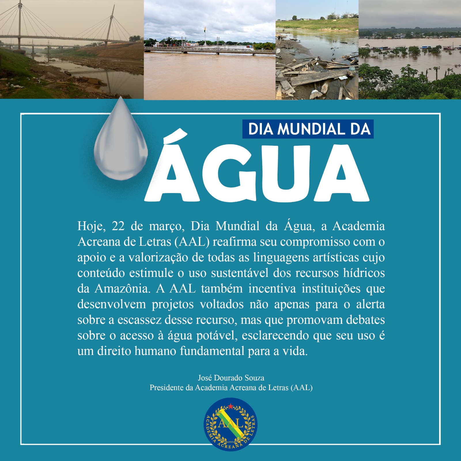 Neste oportuno dia a Academia Acreana de Letras convida todos os seus acadêmicos e a população em geral a refletirem sobre o uso consciente da água, defendendo uma gestão sustentável dos recursos híbridos e o combate permanente aos desperdiço de água.