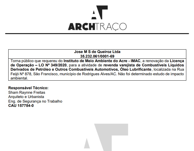 EDITAIS José M S de Queiroz Ltda torna público que requereu do IMAC a renovação da licença de operação para atividade de revenda varejista de combustíveis Publicado 7 meses atrás em 1 de abril de 2025 Por Redação AcreNews Tópicos relacionados: A seguir Raiolando Costa de Oliveira torna público que requereu do IMAC a licença prévia para Comércio varejista de petróleo em Rio Branco Não perca Prefeitura de Plácido de Castro publica edital de licitação para contratação de empresa para asfaltamento de ruas Continue lendo Você pode gostar