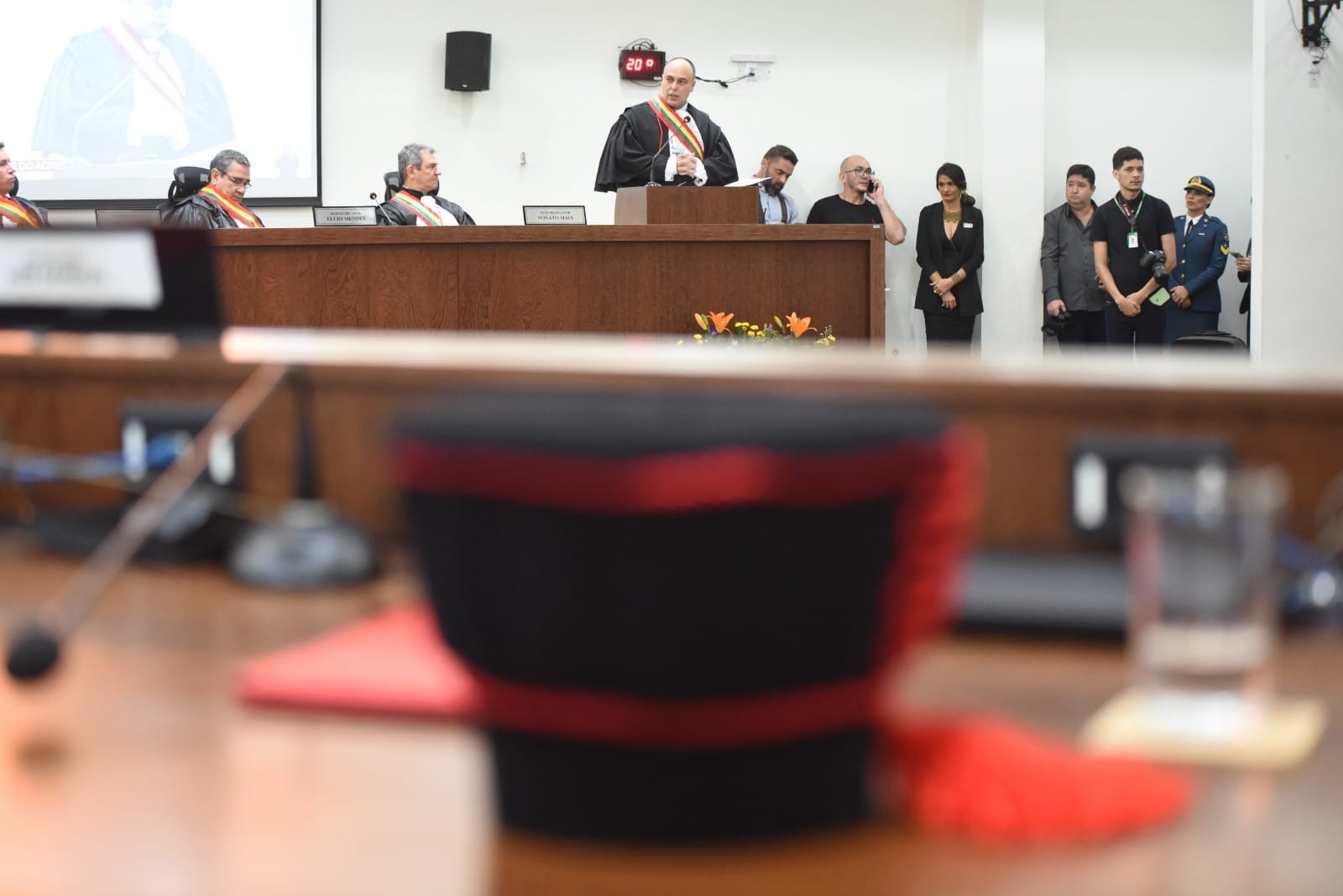 Se fizeram presentes, entre vários outros, o governador do Estado, Gladson Cameli; o presidente da Associação dos Magistrados do Acre (Asmac), o juiz de Direito Gilberto Matos; o deputado estadual Pedro Longo, representando a Assembleia Legislativa do Acre (Aleac); o prefeito de Rio Branco, Tião Bocalom; o procurador-geral de Justiça, Danilo Lovisaro; a defensora pública-geral Simone Santiago; bem como o representante da Ordem dos Advogados do Brasil – Seccional Acre (OAB/AC), Thalles Vinícius Sales.