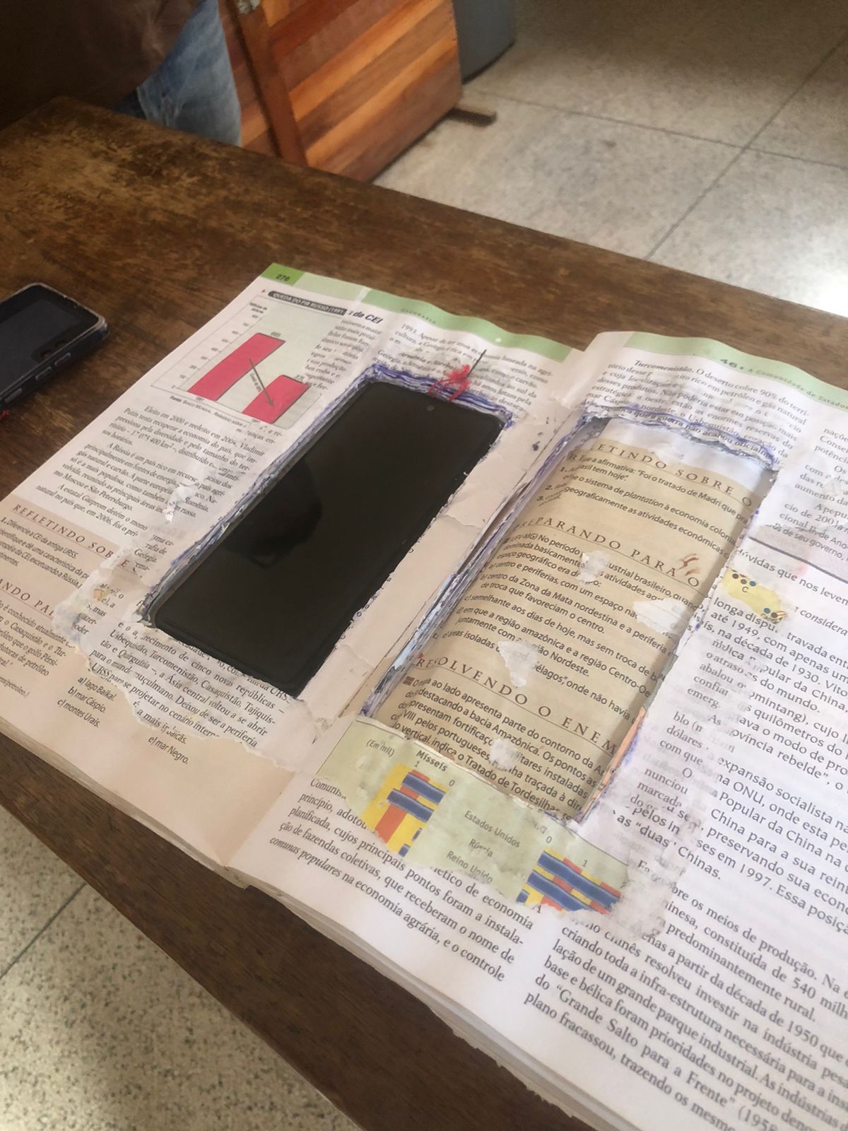 Para não chamar a atenção, o detento abriu um espaço, entre as folhas, com o mesmo tamanho e espessura do telefone.