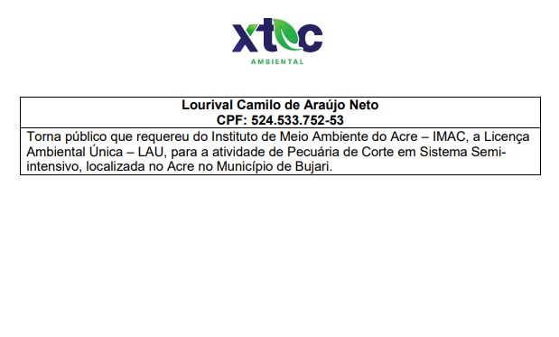 EDITAIS Lourival Camilo de Araújo Neto torna público que requereu licença do Imac para atividade de pecuária de corte Publicado 4 meses atrás em 27 de junho de 2025 Por Redação AcreNews Tópicos relacionados: A seguir Executiva Municipal do MDB de Rio Branco convoca filiados e simpatizantes para convenção no dia 18 de julho Não perca Castilho Engenharia e Empreendimentos S/A informa que recebeu do IMAC licença para usinagem de asfalto em Brasiléia Continue lendo Você pode gostar
