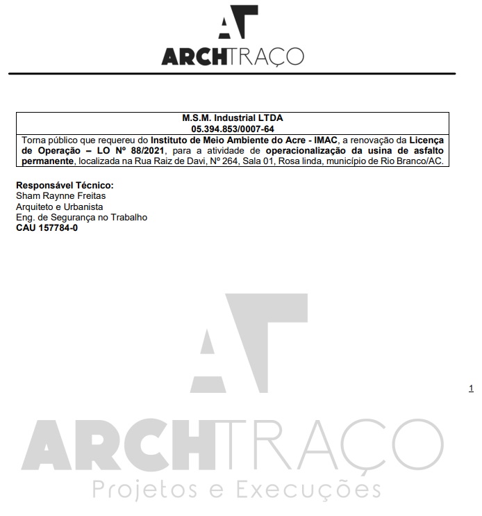 EDITAIS M.S.M Industrial Ltda torna público que requereu do imac a renovação da L.O N°88/2021 para atividade de operacionalização da usina de asfalto permanente Publicado 7 meses atrás em 2 de abril de 2025 Por Redação AcreNews Tópicos relacionados: A seguir Farhat & Farhat Ltda torna público que recebeu do imac a Licença de operação n° 89/2025 com validade de 4 anos para atividade de transporte de produtos perigosos Não perca Pre Molde Indústria torna público que requereu do IMAC a renovação da L.O N°110/2021 para atividade de fabricação de Artefatos de cimento Continue lendo Você pode gostar