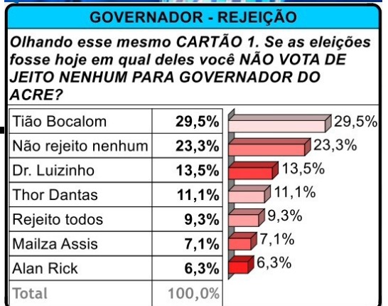 Outro dado que ajuda a explicar a dinâmica do cenário é a rejeição. Bocalom lidera negativamente, com 29,5% afirmando que não votariam nele de forma alguma. Em contraste, Alan Rick registra a menor rejeição (6,3%), seguido por Mailza, com 7,1%, o que a coloca como a segunda menos rejeitada entre os principais nomes. D. Luizinho tem 13,5% de rejeição e Thor Dantas, 11,1%; 9,3% dizem não rejeitar nenhum candidato.
