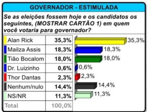 No cenário estimulado, Mailza registra 18,3%, em empate técnico com o patamar de 18%, consolidando-se à frente de Bocalom. Alan Rick mantém a liderança isolada, enquanto Thor Dantas soma 2,3% e D. Luizinho, 0,6%. O contingente de eleitores que declara voto nulo ou em ninguém chega a 14,4%, e os indecisos representam 11,3%, indicando um espaço ainda relevante de definição do eleitorado.
