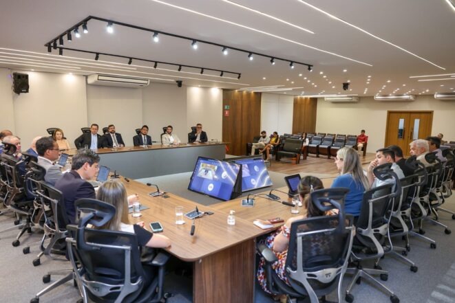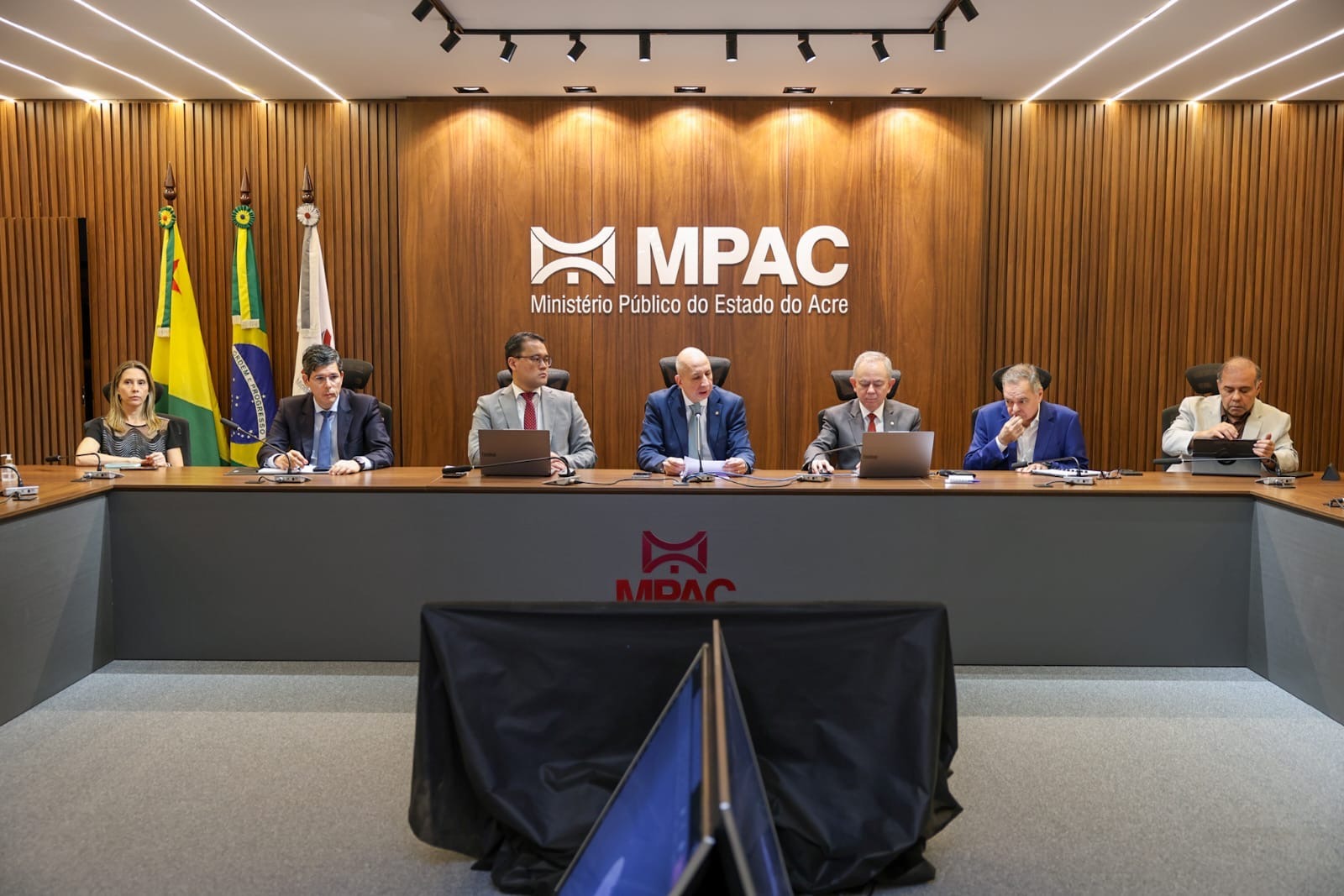 O procurador-geral de Justiça, Danilo Lovisaro do Nascimento, acompanhado de membros da Administração Superior e de diretores do Ministério Público do Estado do Acre (MPAC), participou da primeira reunião do processo de transição de gestão com a equipe indicada pelo procurador-geral de Justiça nomeado para o biênio 2026–2028, Oswaldo D’Albuquerque Lima Neto.