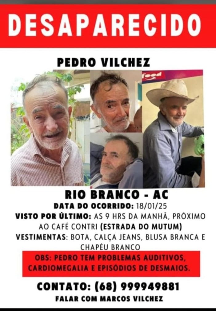 As equipes de busca intensificaram, nesta quarta-feira (21), os esforços para localizar o aposentado Pedro Vilchez, de 87 anos, desaparecido em Rio Branco. O caso, que já completa três dias, está sob investigação da Delegacia de Homicídios e Proteção à Pessoa (DHPP), que colheu depoimentos de familiares para traçar o possível trajeto do idoso.