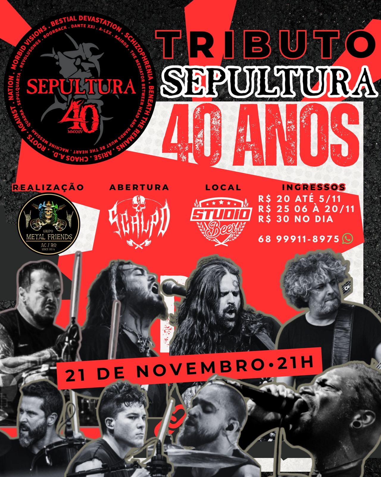 A banda brasileira de maior sucesso e alcance mundial completou recentemente 40 anos de história. Com sucessos inesquecíveis e arrasadores o Sepultura tornou-se referência do metal extremo no mundo todo. Para celebrar este enorme legado, nesta sexta-feira, 21, no Studio Beer, será realizado o TRIBUTO SEPULTURA 40 ANOS, que virá repleto de sucessos de todas as fases da banda mineira.