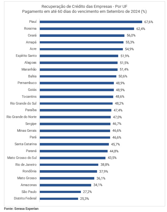 Na análise por região, o Nordeste teve a melhor taxa de recuperação de dívidas inadimplidas em setembro e pagas em até 60 dias do mês de referência, com 51,8% ressarcidas. Em sequência ficou o Sul (43,9%), seguido pelo Norte (42,6%), Sudeste (39,2%) e Centro-Oeste (38,9%).