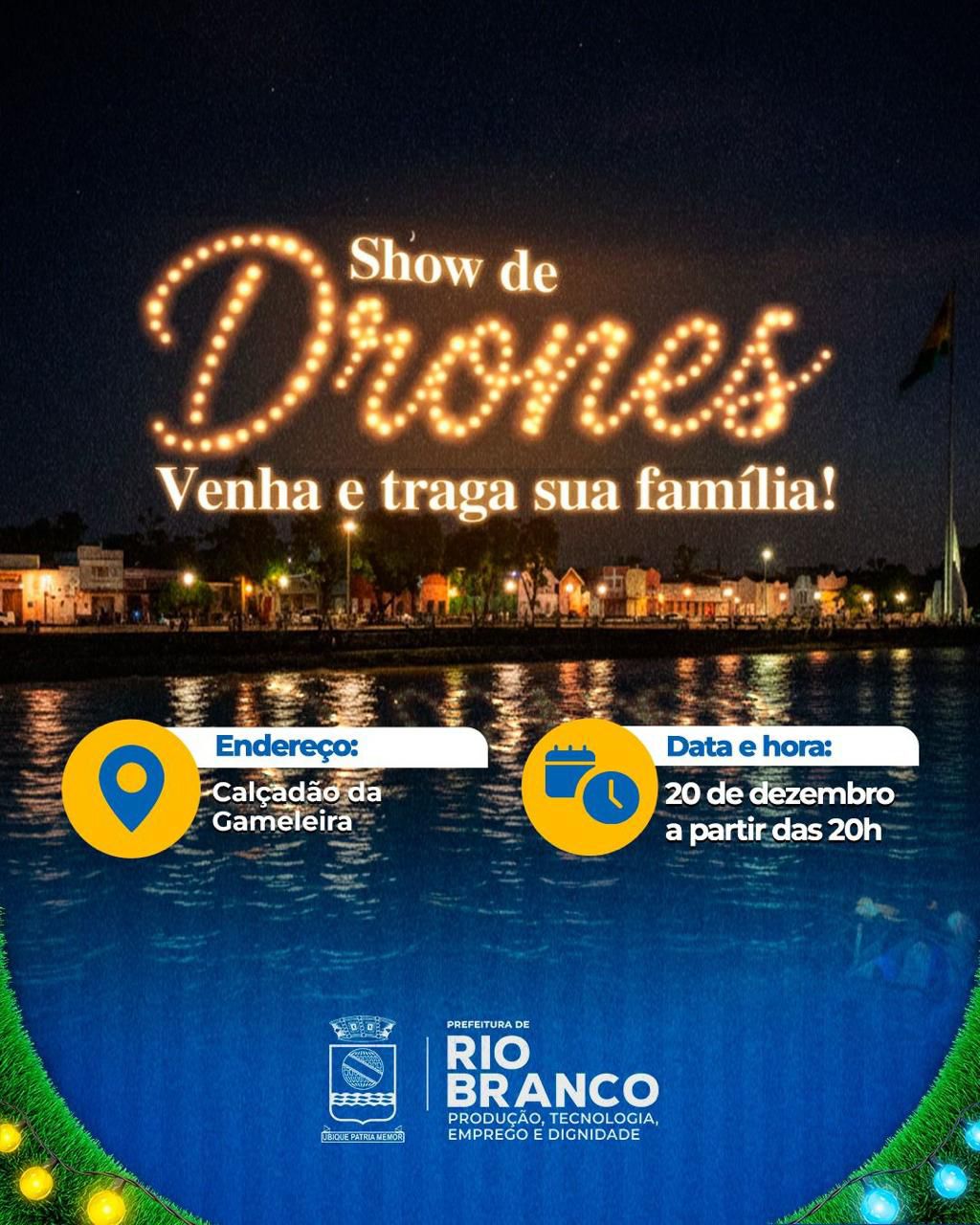 A Prefeitura de Rio Branco promove, neste sábado, 20 de dezembro, um evento inédito para celebrar as festividades de fim de ano: o Show de Drones. O espetáculo ocorrerá no Calçadão da Gameleira, um dos pontos turísticos mais tradicionais da capital acreana, a partir das 20h.