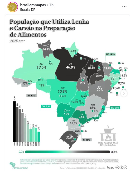 O Acre está entre os estados brasileiros onde o uso de lenha e carvão na preparação de alimentos permanece elevado: 17% da população ainda depende desses combustíveis, acima da média nacional de 14,5%. Segundo a plataforma Brasil em Mapas, o dado revela que, apesar do avanço da transição energética doméstica no país, persistem desigualdades regionais e sociais no acesso a fontes modernas de energia.