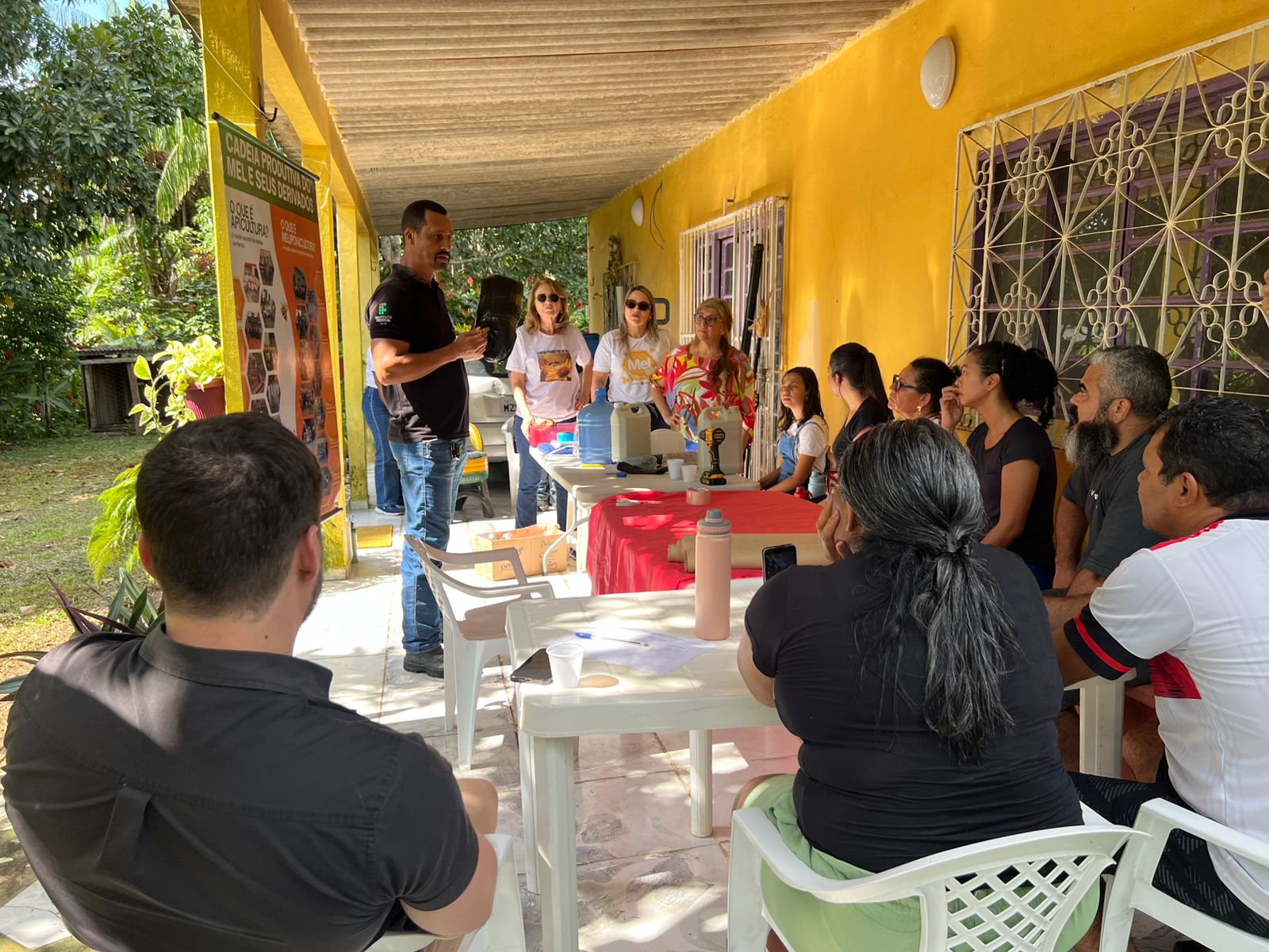 Durante a oficina, a equipe técnica da cadeia do mel, com apoio de um profissional da área de zootecnia, conduziu atividades práticas e teóricas voltadas à capacitação dos participantes. Entre os temas abordados, estiveram orientações sobre a produção e o uso de iscas para a captura de abelhas sem ferrão, além de explicações técnicas sobre a implantação e o manejo de viveiros de mudas.