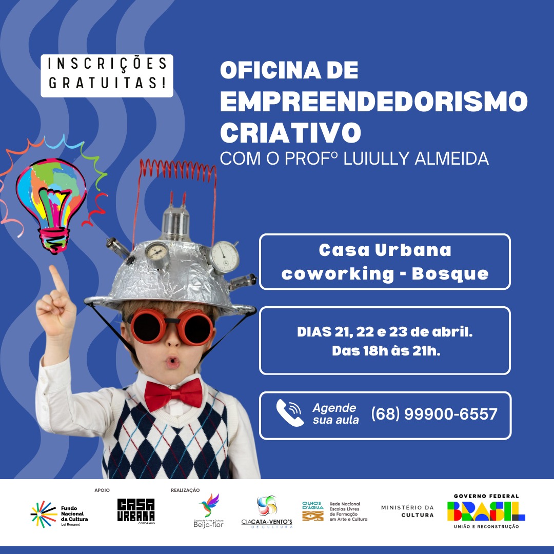 Também com o professor LuiuIly Almeida, a oficina acontece na Casa Urbana Coworking nos dias 21, 22 e 23 de abril, das 18h às 21h. O objetivo é capacitar os participantes para desenvolverem negócios sustentáveis com base na criatividade. Agendar aula: (68) 99900-6557.