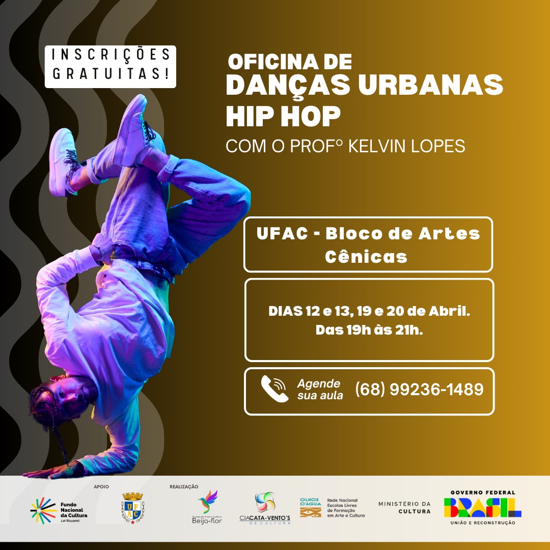 Ministrada pelo professor Kelvin Lopes, a oficina ocorre no Bloco de Artes Cênicas da UFAC nos dias 12, 13, 19 e 20 de março, sempre às terças e quintas-feiras, das 7h às 11h. Os participantes aprenderão técnicas de hip hop e estilos urbanos. Agendar aula: (68) 99236-1489.