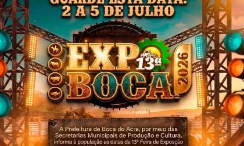 Por Wanglézio Braga A Prefeitura de Boca do Acre anunciou oficialmente a realização da 13ª edição da Expoboca, uma das principais feiras agropecuárias do município do...