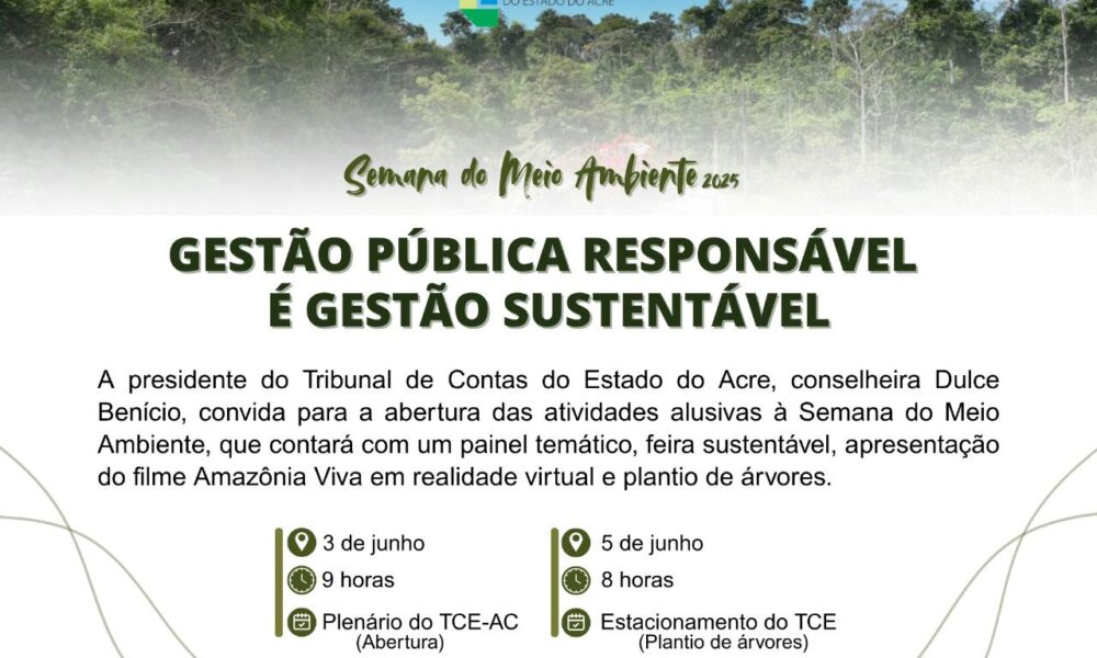 O Tribunal de Contas do Estado do Acre (TCE-AC) promove, entre os dias 3 e 5 de junho, a programação da Semana do Meio Ambiente 2025,...