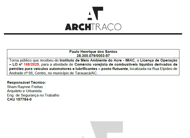 Paulo Henrique dos Santos torna público que recebeu do imac a Licença de operação n° 168/2025 com validade de 4 anos para atividade de comércio Varejista de Combustíveis