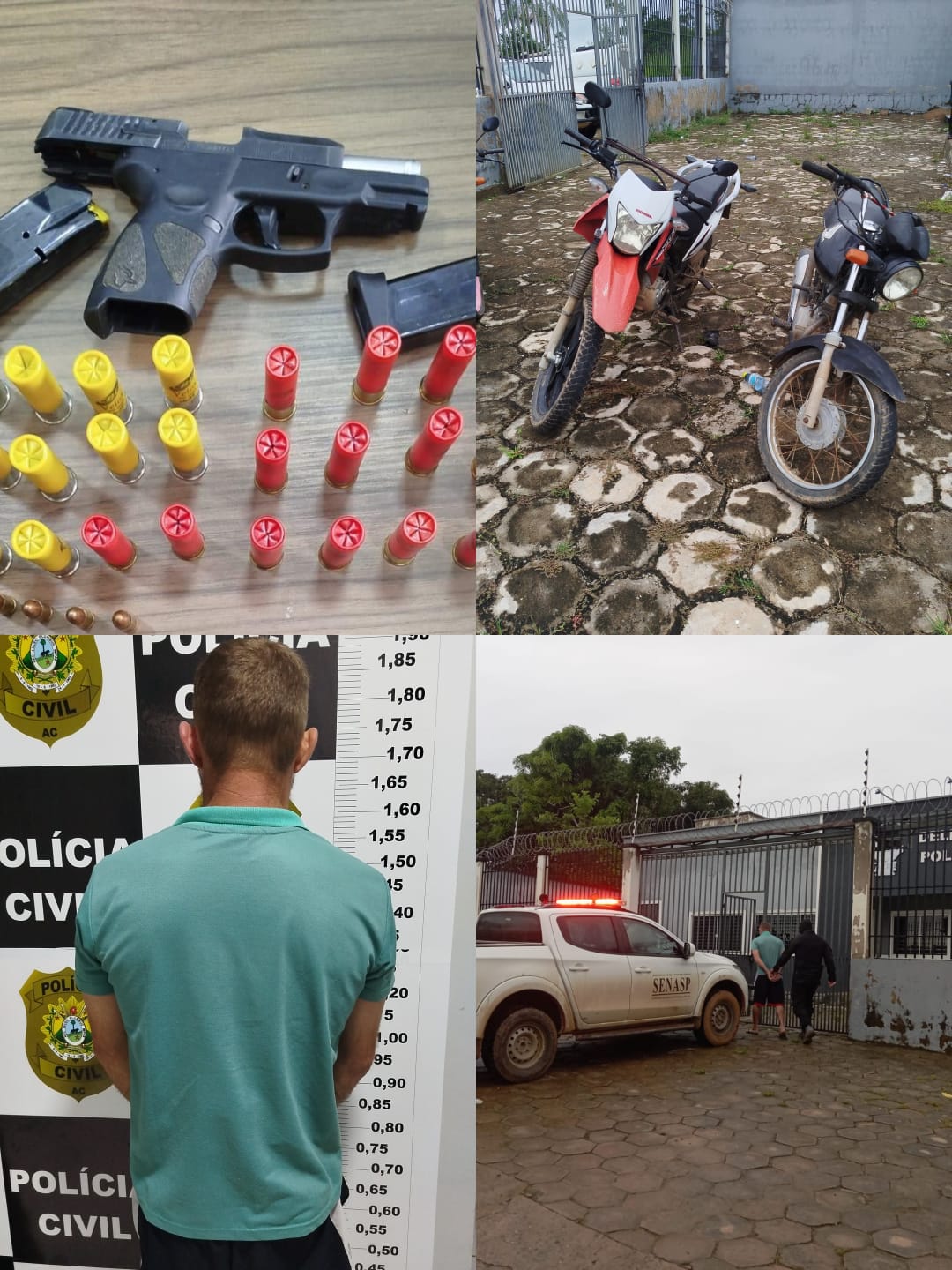 Durante a ação, os policiais apreenderam uma pistola calibre 9 milímetros, com dois carregadores, além de munições de pelo menos três calibres diferentes. Também foram recolhidos dois aparelhos celulares e duas motocicletas.