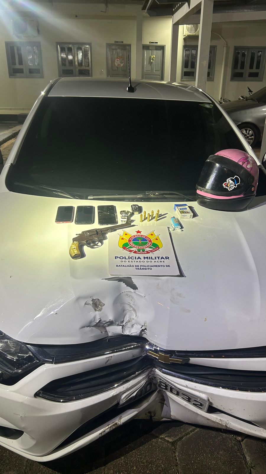 O Batalhão de Policiamento de Trânsito (Bptran) da Polícia Militar do Acre (PMAC) realizou a prisão de quatro indivíduos que empreenderam fuga da guarnição em um carro roubado, durante a noite desta quarta-feira, 04.