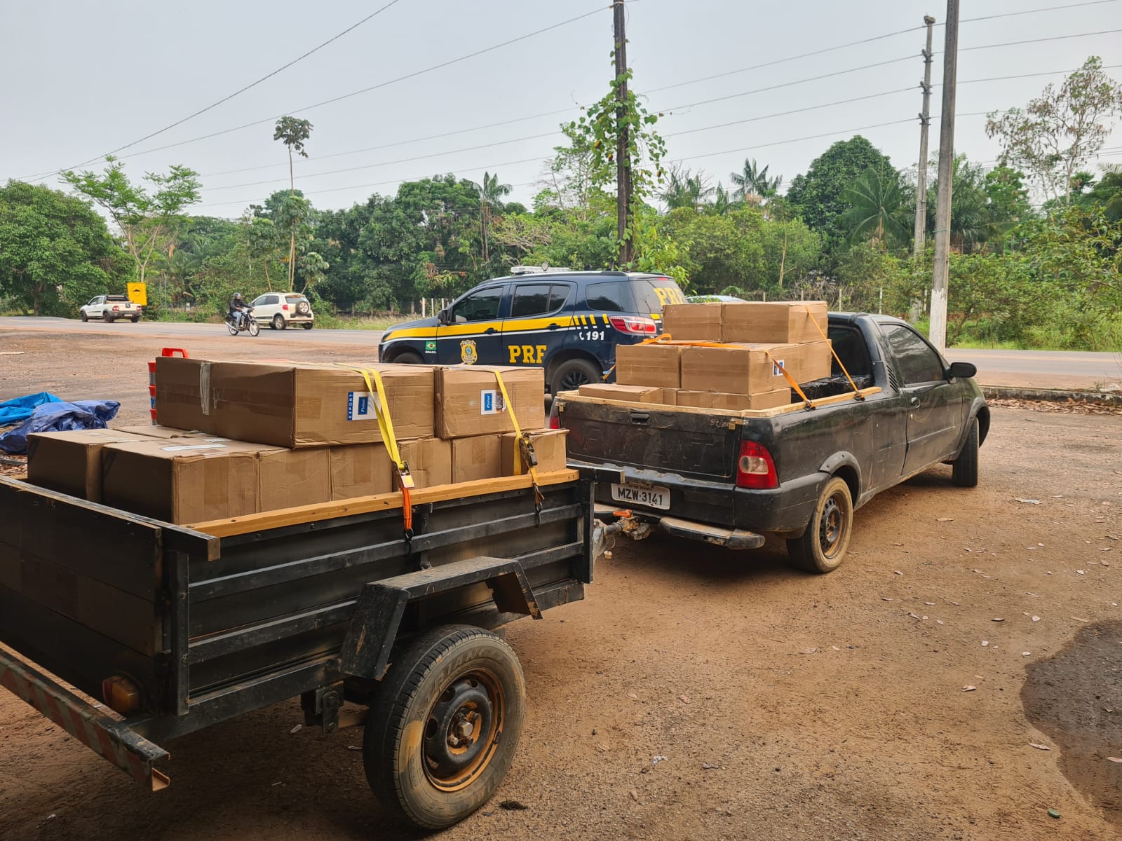 Na manhã desta segunda-feira (16), uma equipe da Polícia Rodoviária Federal (PRF) apreendeu aproximadamente 22.500 maços de cigarros da marca Point, de origem estrangeira, no KM 90 da BR-364, em Senador Guiomard, Acre. A apreensão ocorreu durante uma fiscalização de rotina, quando os agentes notaram um veículo com carga excessiva na carroceria e rebocando uma carretinha sem placa, também carregada. O condutor obedeceu à ordem de parada e informou que a carga era composta por cigarros vindos da Bolívia.