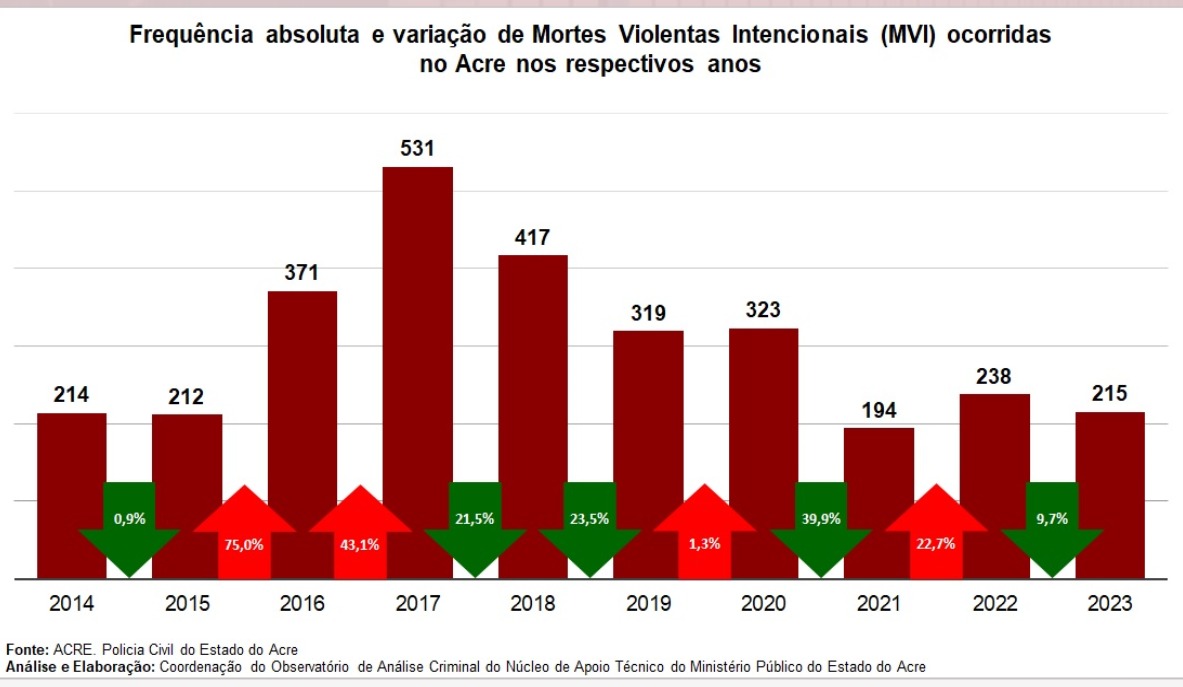 Os crimes contra a vida seguem em queda no Acre, apesar de um recrudescimento observado no início do ano passado -e, nesse contexto, os conflitos entre facções foram reduzidos substancialmente em todo o Estado, notadamente entre 2023 e 2024. Analisando os dados do Observatório de Análise Criminal do Ministério Público do Acre, 42,65% das mortes violentas intencionais (MVIs) ocorridas no Acre em 2023 tiveram como motivação a disputa das facções. Já em 2024, o percentual caiu para 37,06%, redução de 13,10% nos assassinatos entre grupos criminosos na disputa por território e drogas.