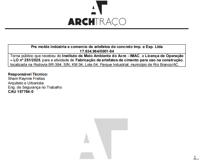 EDITAIS Pre Molde Indústria de Concreto torna público que requereu do IMAC licença para fabricação de artefatos de cimento Publicado 4 meses atrás em 12 de junho de 2025 Por Redação AcreNews Tópicos relacionados: A seguir Comissão pró-fundação da Associação Desportiva Cruzeiro do Tangará convoca interessados para assembleia geral dia 16 Não perca Castilho Engenharia e Empreendimentos S/A torna público que requereu do IMAC o encerramento de licença para usina de asfalto Continue lendo Você pode gostar