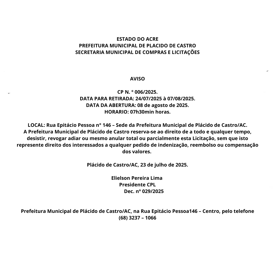 EDITAIS Prefeitura de Plácido de Castro publica aviso de licitação 006/2025 com data de retirada até 7 de agosto Publicado 3 meses atrás em 23 de julho de 2025 Por Redação AcreNews Tópicos relacionados: A seguir Clube dos Oficiais da Polícia Militar e Corpo de Bombeiros do Acre publica edital de convocação para assembleia Não perca Empresa Vida Íntima Serviços em Ginecologia e Obstetrícia LTDA informa que requereu da Semeia licença para atividade médica ambulatorial Continue lendo Você pode gostar
