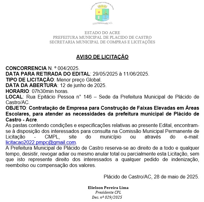 EDITAIS Prefeitura de Plácido de Castro publica aviso de licitação para contratação de empresa de contrução de faixas em frente a escolas Publicado 5 meses atrás em 28 de maio de 2025 Por Redação AcreNews Tópicos relacionados: A seguir Posto Triângulo Ltda informa que requereu do IMAC licença para transporte rodoviário de combustíveis Não perca J P L Combustíveis Ltda torna público que recebeu do IMAC a Licença de operação N° 221/2025 para atividade de comércio varejista de combustíveis valida por 4 anos Continue lendo Você pode gostar