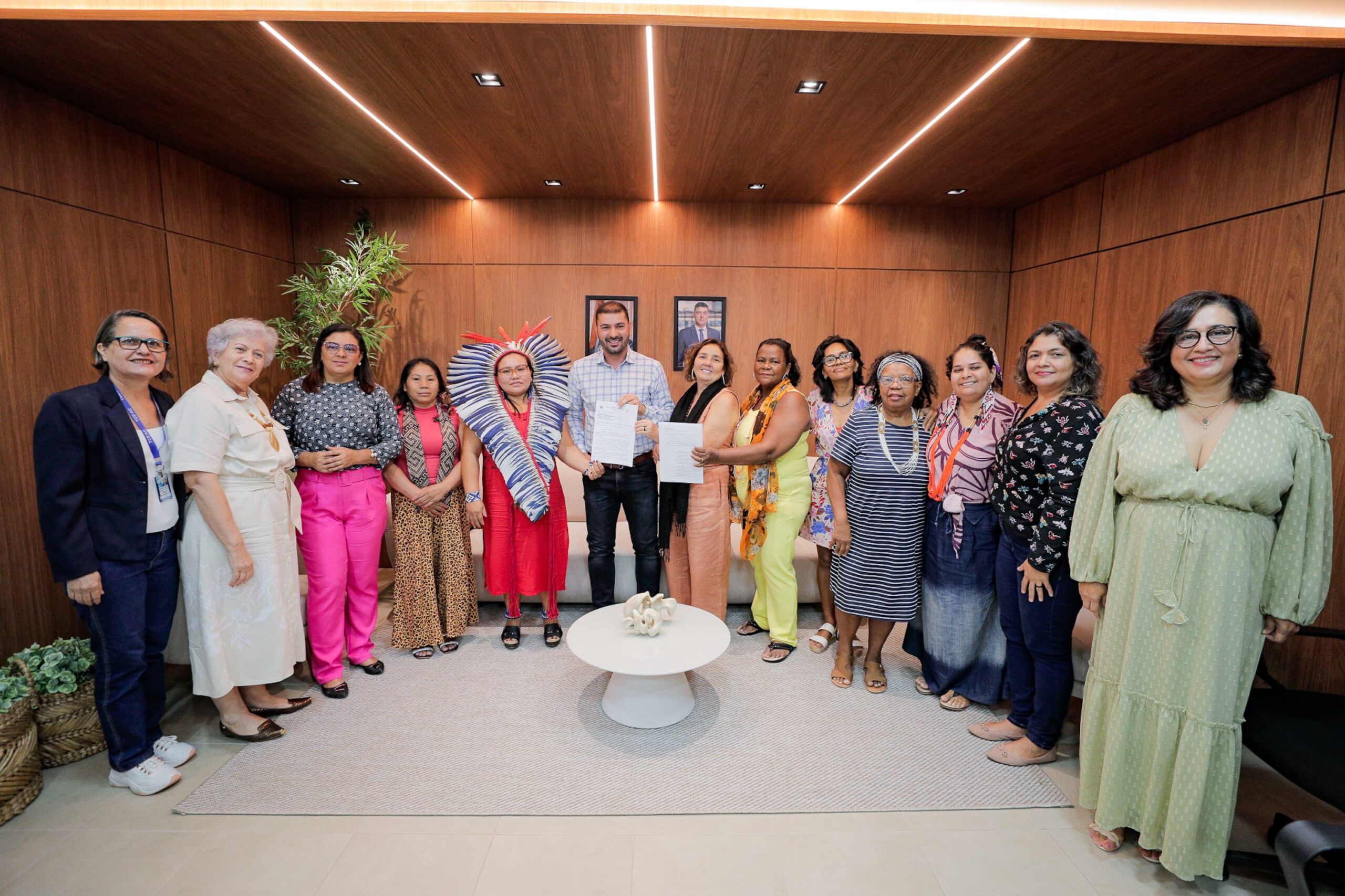 Lideranças da Associação de Mulheres Negras, do Instituto de Mulheres da Amazônia, do Centro de Trabalhadores da Amazônia, do Movimento Negro Unificado, da Federação do Povo Huni Kuin e da Organização das Mulheres Indígenas do Acre, Sul do Amazonas e Noroeste de Rondônia sentaram à mesa com o presidente para apresentar a necessidade de buscar uma estratégia para melhorar a aplicabilidade do orçamento destinado às políticas públicas de gênero.
