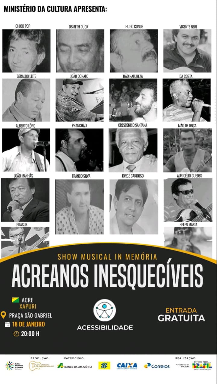 Acreanos Inesquecíveis, vai além de um show em homenagem aos nossos grandes artistas já falecidos, conta com a participação da renomada radialista Nilda Dantas, como apresentadora, e grandes intérpretes como Tony Ferreira, Átila Miller, Cris Nágila, Lucas, Leonel Grangeiro e João França. Um show gratuito, para todas às idades, com tradutores de libras e contrapartida ambiental.