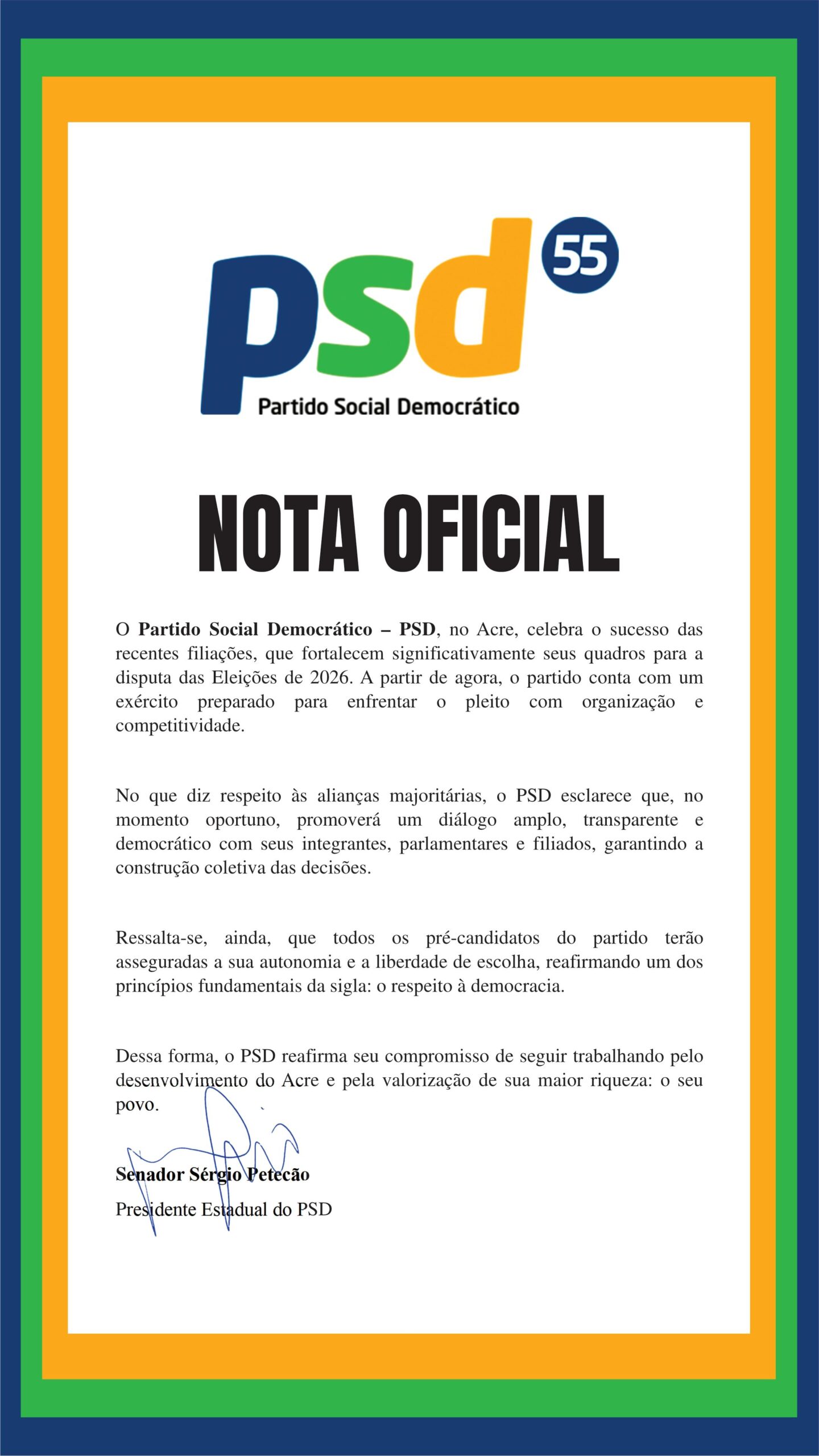 O Partido Social Democrático no Acre divulgou, em 6 de abril, nota oficial em que destaca o fortalecimento da sigla, mas evita antecipar definições sobre alianças para as eleições de 2026. Liderado pelo senador Sérgio Petecão, o partido aposta na ampliação de filiações e na construção de uma base competitiva, sem pressa para fechar acordos majoritários.
