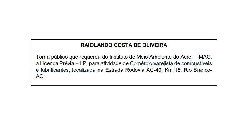 EDITAIS Raiolando Costa de Oliveira torna público que requereu do IMAC a licença prévia para Comércio varejista de petróleo em Rio Branco Publicado 7 meses atrás em 2 de abril de 2025 Por Redação AcreNews Tópicos relacionados: A seguir Pre Molde Indústria torna público que requereu do IMAC a renovação da L.O N°110/2021 para atividade de fabricação de Artefatos de cimento Não perca José M S de Queiroz Ltda torna público que requereu do IMAC a renovação da licença de operação para atividade de revenda varejista de combustíveis Continue lendo Você pode gostar