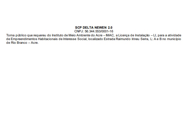 SCP Delta Newen 2.0 torna público que requereu do IMAC licença para empreendimentos habitacionais na Irineu Serra