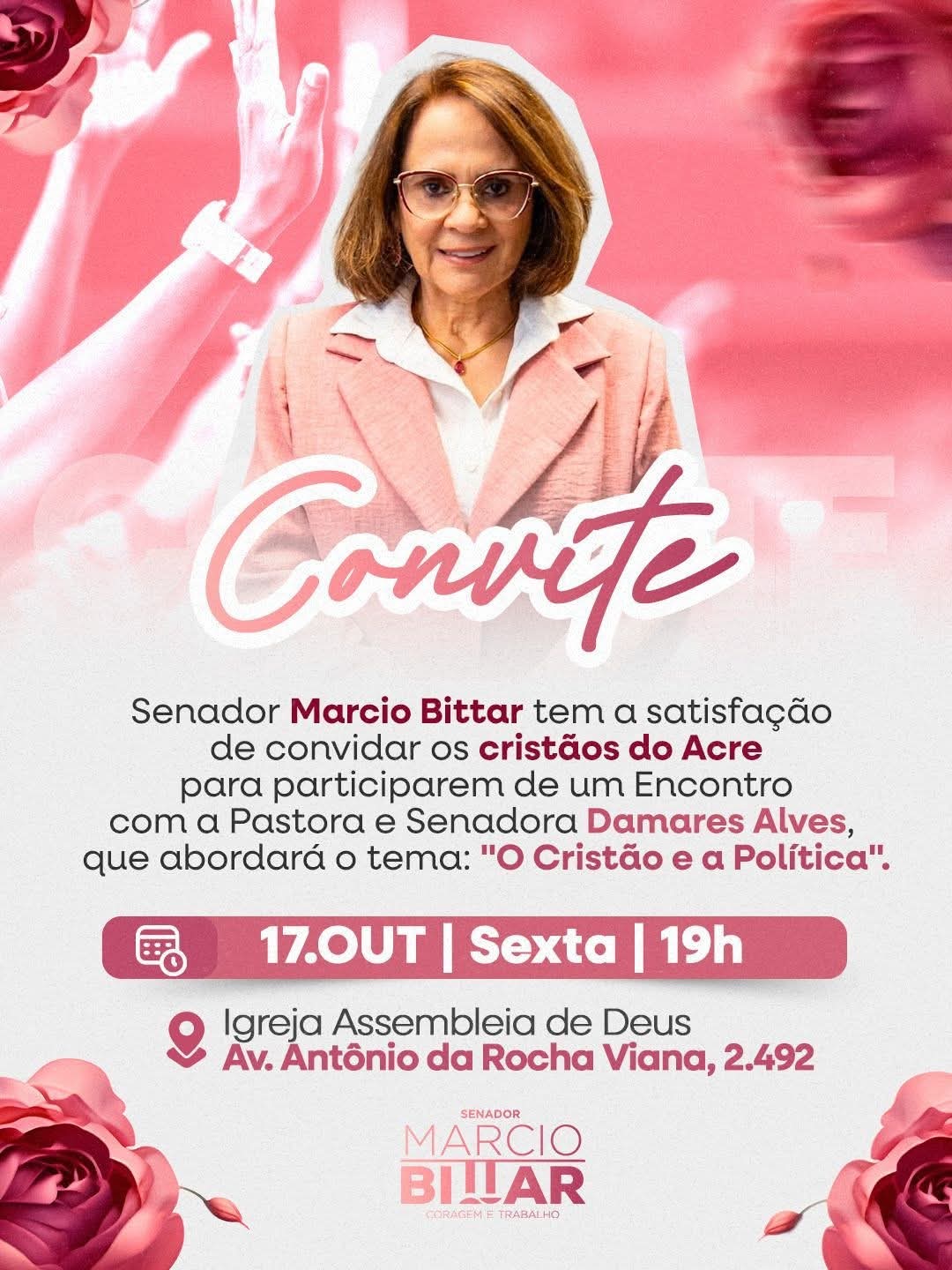 O senador Marcio Bittar (PL) está convidando os cristãos acreanos para participarem de um encontro especial com a pastora e também senadora Damares Alves (Republicanos-DF). O evento será realizado no dia 17 de outubro, uma sexta-feira, a partir das 19 horas, na Igreja Assembleia de Deus, localizada na Avenida Antônio da Rocha Viana, nº 2.492, em Rio Branco.