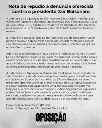 A nota acima é a resposta imediata da oposição na Câmara Federal, nesta terça-feira, 19/02, em que a Procuradoria Geral da República – PGR ofereceu a denúncia contra Jair Bolsonaro e mais 33 aliados. Os crimes apontados foram paridos a cada dia nos últimos dois anos em pesca probatória (ilegal), a partir dos telefones apreendidos, e de delações ou confissões conseguidas na cadeirinha da Polícia Federal. Tem pra todo gosto, afinal, pesca-se (ou caça-se) até baleia incomodada em alto mar desde que seja para incriminar o ex-Presidente.