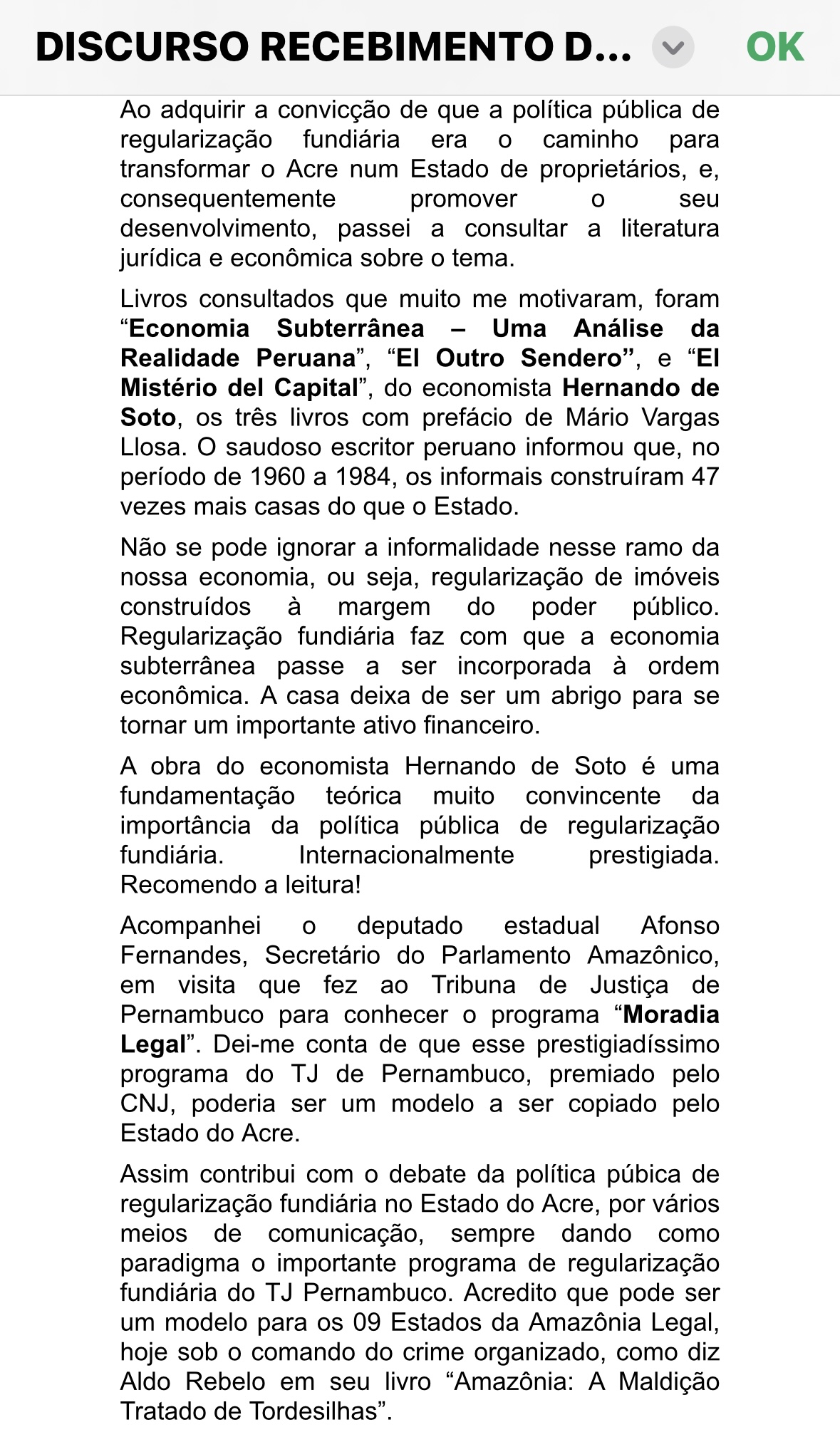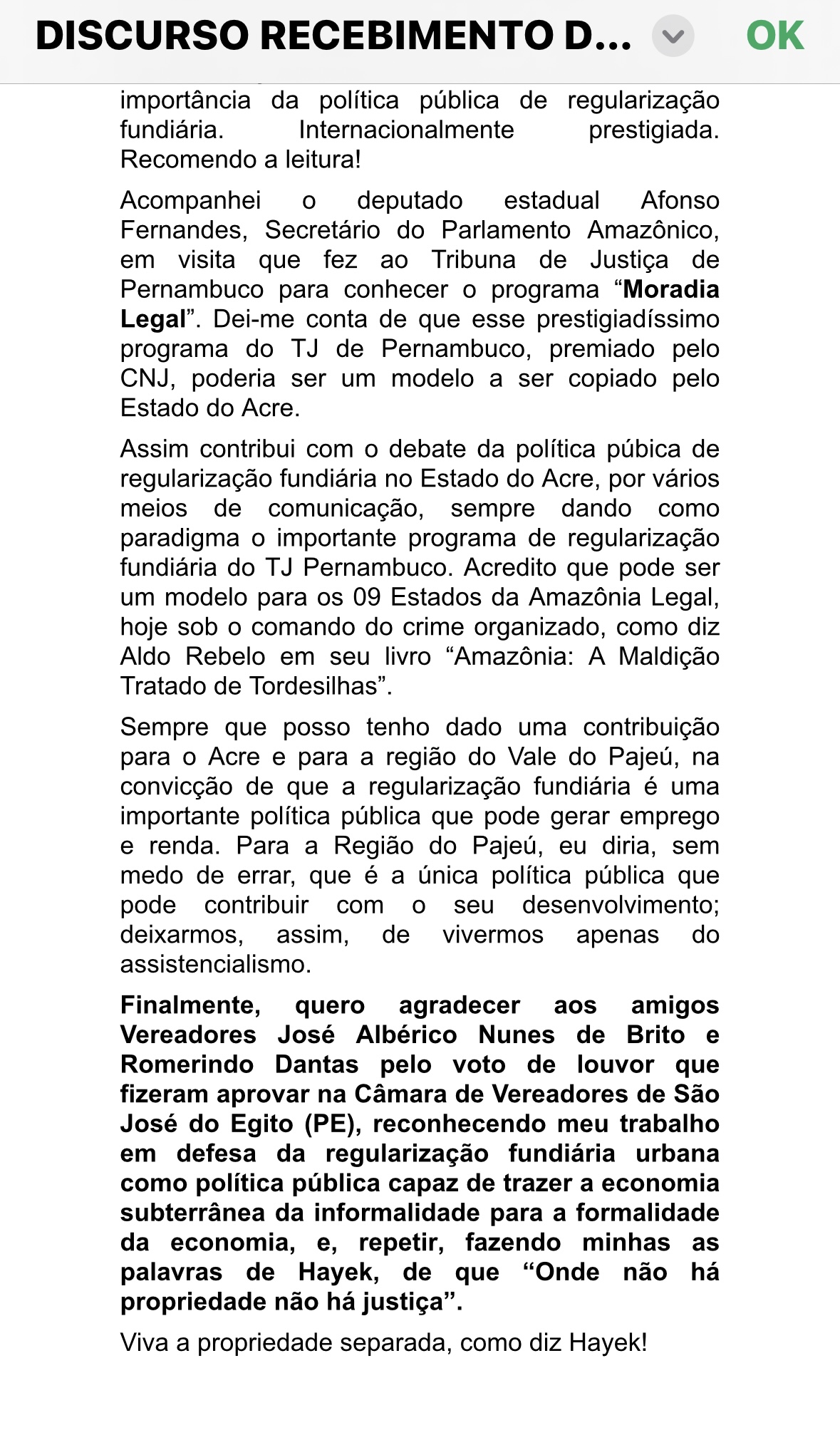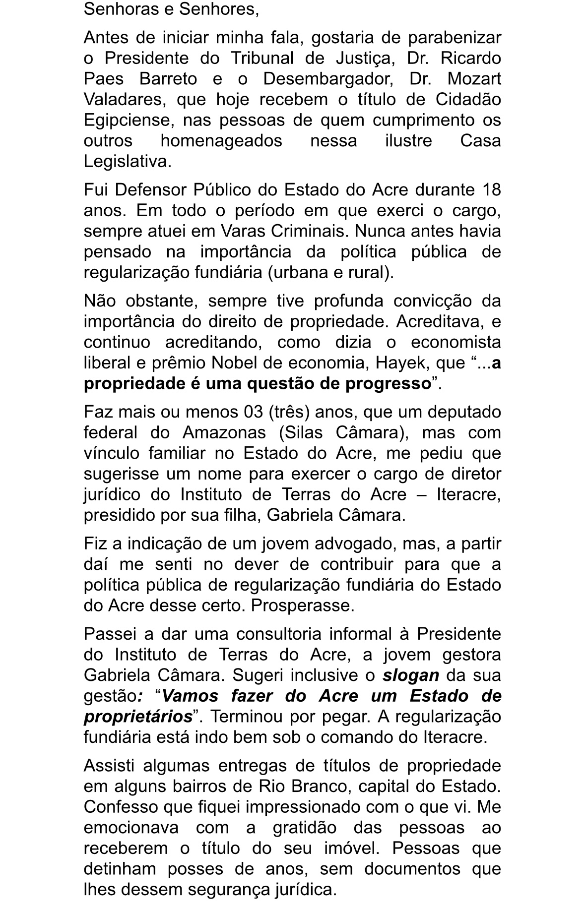 O defensor público Valdir Perazzo Leite, acreano por opção, foi homenageado pela Câmara Municipal de São José do Egito, município de Pernambuco, por sua luta em favor da regularização fundiária no Brasil, sobretudo no Acre e na região Nordeste. Os vereadores lhe concederam uma moção de aplausos. Em sua fala, que o AcreNews publica a seguir, Perazzo faz um apanhado, cita acreanos importantes nessa luta e prevê, otimista: “Vamos fazer do Acre um Estado de proprietários”.